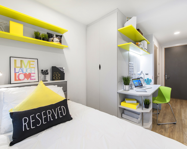 Ubicada a 18 minutos andando de la escuela con fácil acceso al Trinity College y Connell Street. La residencia tiene gimnasio y una zona común de juegos como bolera, golf, tenis, de mesa y sala de cine. La residencia cuenta con seguridad 24 hrs, máquinas expendedoras y conexión WiFi. Las habitaciones tienen baño privado y un salón-cocina compartida con otro 4- 5 estudiantes equipado con TV, sofás y un microondas, horno y nevera cada dos estudiantes, se incluyen sábanas pero no toallas.